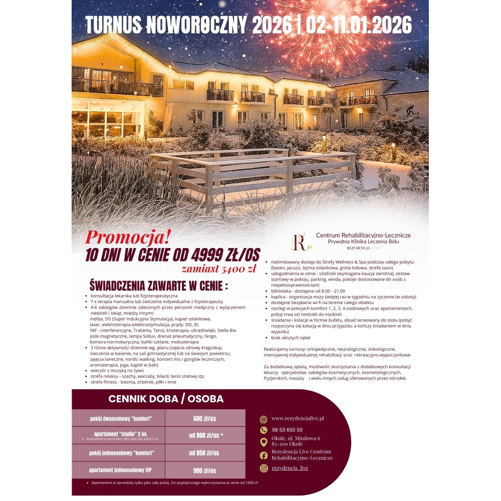 Zadbaj o swoje zdrowie i samopoczucie w wyjątkowym miejscu – Rezydencja Live Centrum Rehabilitacyjno-Lecznicze zaprasza na pełnopłatny turnus rehabilitacyjny, łączący intensywną terapię z relaksem w nowoczesnej strefie Wellness & Spa.
