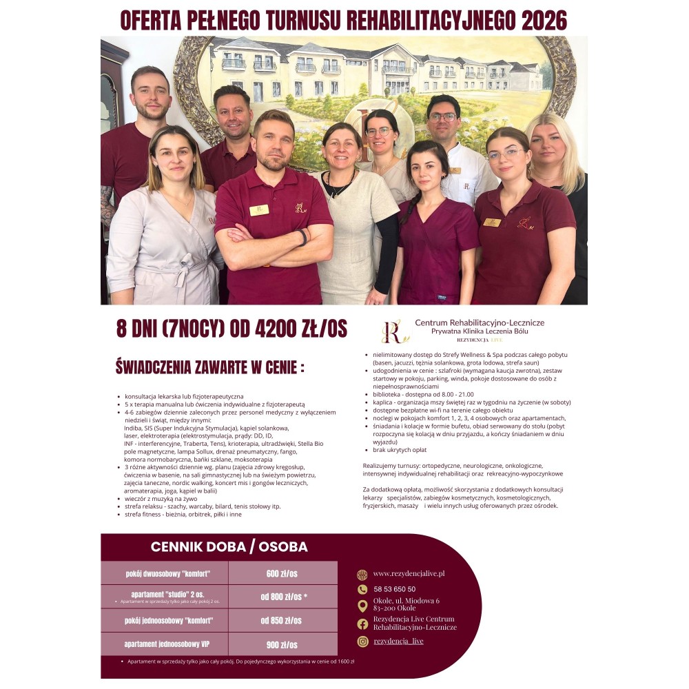 • 4–6 zabiegów dziennie zaleconych przez personel medyczny z wyłączeniem niedziel i świąt, między innymi: