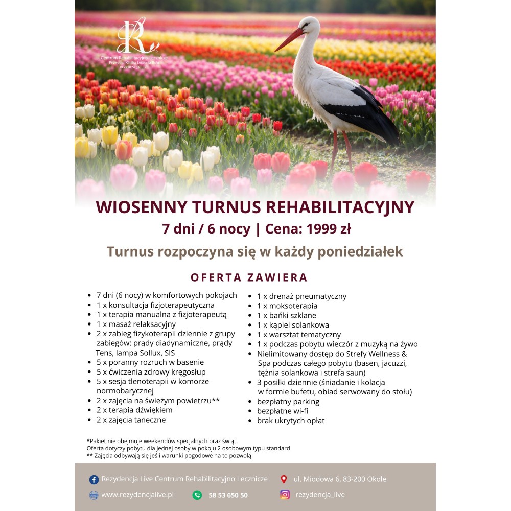 Przywitaj wiosnę z nową energią! Wiosenny Turnus Rehabilitacyjny to idealna propozycja dla osób, które chcą zregenerować organizm po zimie, korzystając z profesjonalnej opieki medycznej i luksusowej strefy relaksu. Nasz program to unikalne połączenie aż 5 zabiegów i aktywności dziennie z nieograniczonym czasem na odpoczynek w strefie Wellness oraz spacerami w budzącej się do życia naturze.