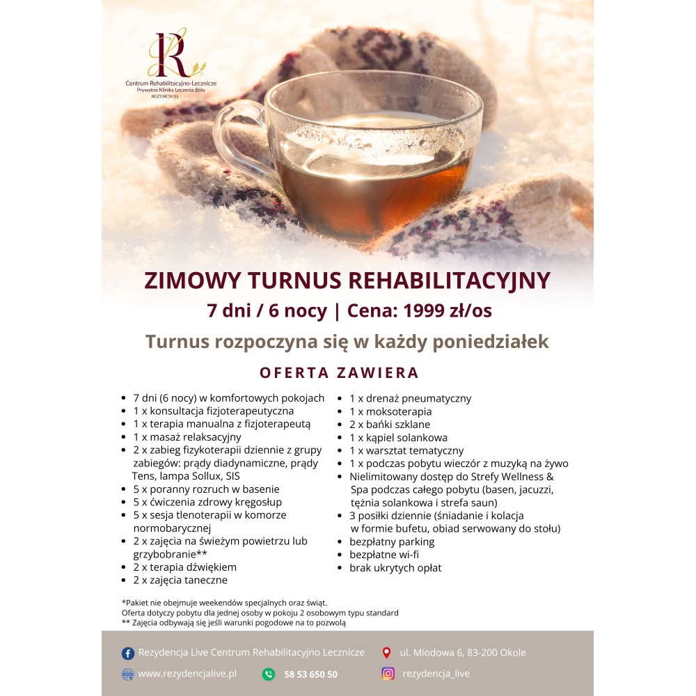 Zima w Rezydencji Live to czas, w którym troska o zdrowie łączy się z wyjątkowym komfortem. Zimowy Turnus Rehabilitacyjny został zaprojektowany tak, aby wzmocnić Twój organizm w mroźne dni, oferując intensywny program terapeutyczny – aż 5 zabiegów i aktywności dziennie – oraz nieograniczony czas na relaks w gorącej strefie Wellness. To idealna okazja, by połączyć profesjonalną fizjoterapię z zimowym wypoczynkiem w przytulnej atmosferze.